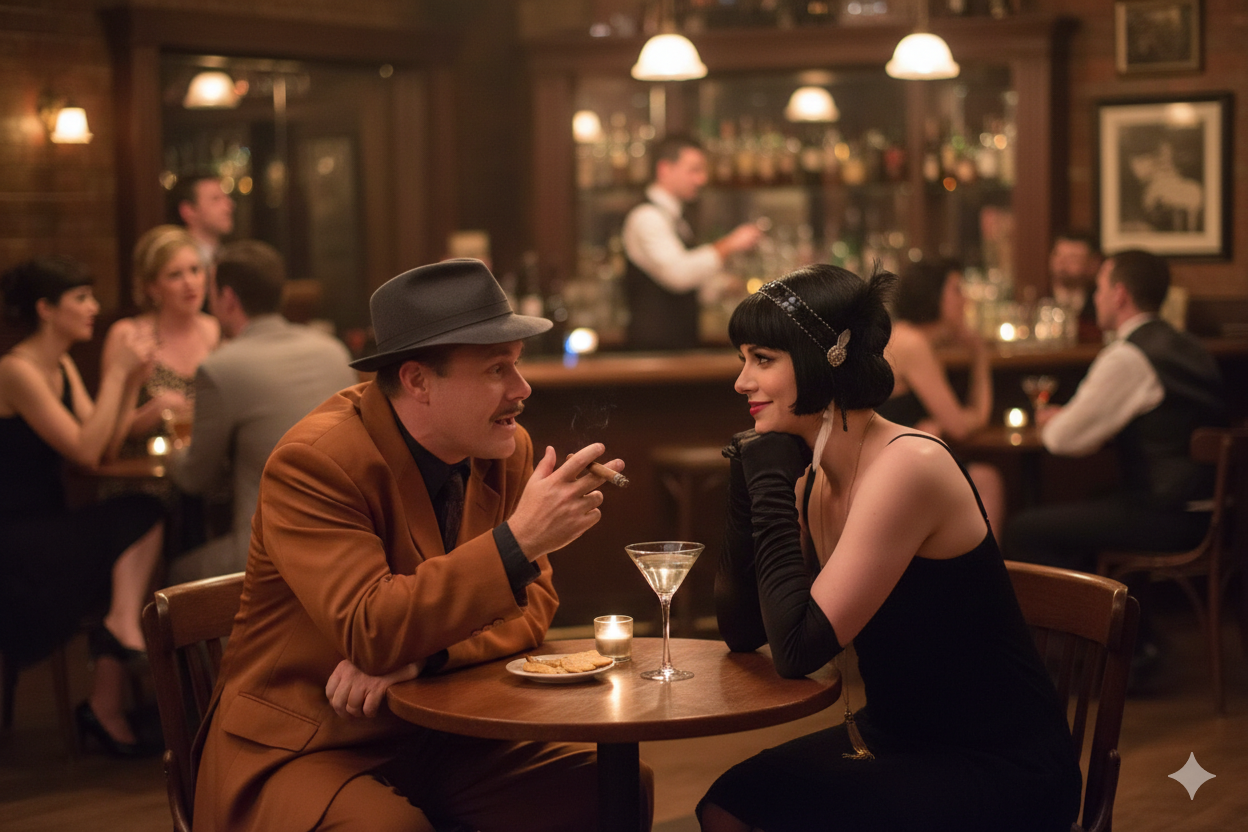 Upon entry, guests are greeted by the club’s sharp-tongued hostess and introduced to the house rules: no fighting, no heaters, no hooch from the outside—and if the coppers show up, drinks go under the table. From there, our performers circulate throughout the space, delivering playful warnings, shady deals, and period-perfect banter that pulls guests into the world of flappers, gangsters, and backroom intrigue.